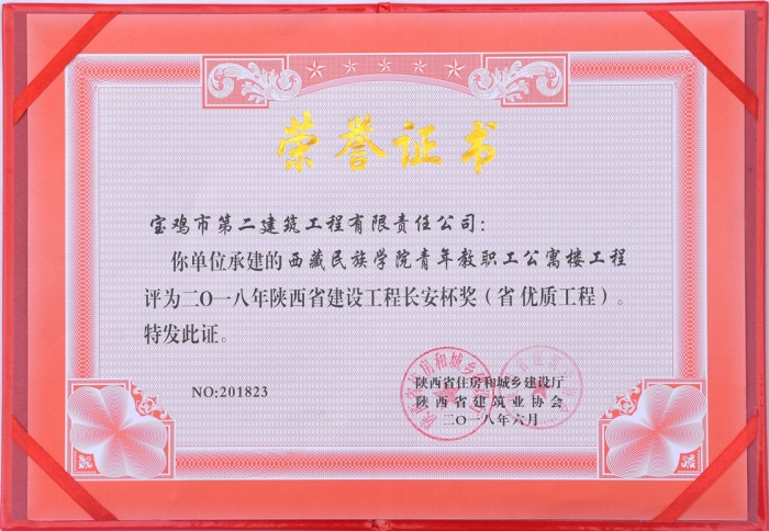 長安杯獎是陜西省住房和城鄉(xiāng)建設(shè)廳評選、頒發(fā)的本省建設(shè)工程質(zhì)量最高榮譽(yù)獎。西藏民族學(xué)院青年職工公寓樓工程是西藏民族學(xué)院(現(xiàn)更名西藏民族大學(xué))確定的重點(diǎn)建設(shè)工程項(xiàng)目,也是公司推行內(nèi)部模擬股份制架構(gòu)下精細(xì)化管理模式試點(diǎn)項(xiàng)目。在建設(shè)初期,公司總部精心策劃,全力部署,公司領(lǐng)導(dǎo)多次蒞臨施工現(xiàn)場檢查指導(dǎo)工作。公司副總經(jīng)理兼項(xiàng)目經(jīng)理曾永祥精心組織,細(xì)化分工,責(zé)任到人,嚴(yán)格要求項(xiàng)目部全體管理人員,并堅(jiān)持以身作則,帶領(lǐng)整個團(tuán)隊(duì),戰(zhàn)高溫、抗嚴(yán)寒、抓質(zhì)量、搶進(jìn)度,最終完成了這項(xiàng)經(jīng)得起各方檢驗(yàn)的優(yōu)質(zhì)工程,為業(yè)主和社會交上了一份滿意的答卷。