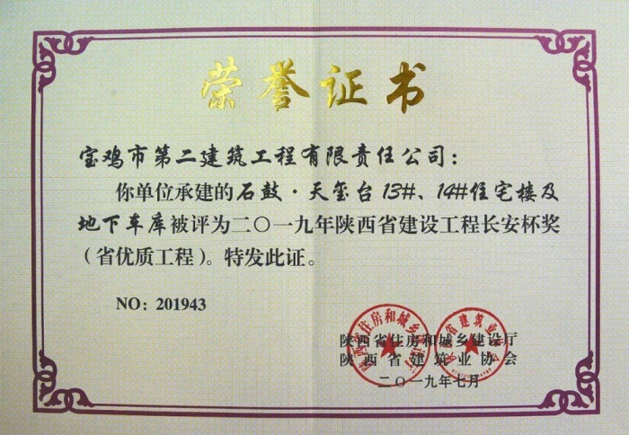 11月12日,陜西省住建廳組織在西咸新區(qū)灃西新城西部科技創(chuàng)新港舉行頒獎儀式,由公司第三十四項目部承建的石鼓·天璽臺13#、14#住宅樓及地下車庫工程和第三十五項目部承建的西安高新綜合保稅區(qū)保稅倉庫一期項目雙獲2019年陜西省建設(shè)工程“長安杯”,這是公司獲得的第20、21項“長安杯”。
