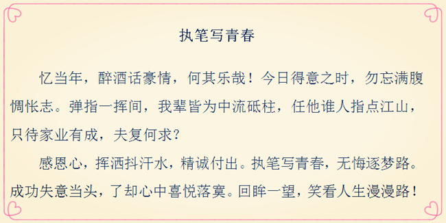 “現(xiàn)在,青春是用來奮斗的;將來,青春是用來回憶的?!碑?dāng)所有的經(jīng)歷化作記憶,那些年少時為理想揮灑的汗水,為成功付出的艱辛,終將成為彌足珍貴的人生財(cái)富。