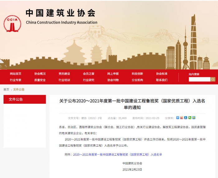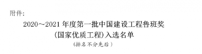 2月23日,中國建筑業(yè)協(xié)會公布了2020~2021年度第一批中國建設工程魯班獎(國家優(yōu)質(zhì)工程)入選名單。