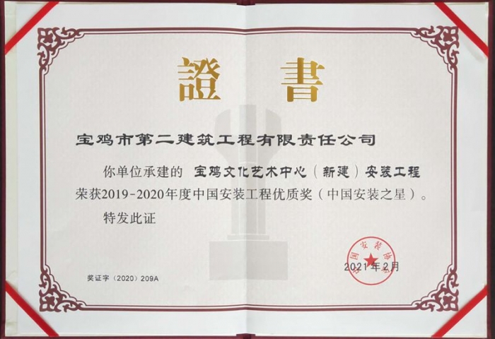 4月22日,中國安裝協(xié)會第七屆二次理事(擴大)會議暨工程創(chuàng)優(yōu)經(jīng)驗交流會在濟南召開。會議對2019-2020年度中國安裝工程優(yōu)質(zhì)獎(中國安裝之星)獲獎企業(yè)及個人進行了表彰,由寶雞二建承建的寶雞文化藝術(shù)中心項目安裝工程獲此殊榮。